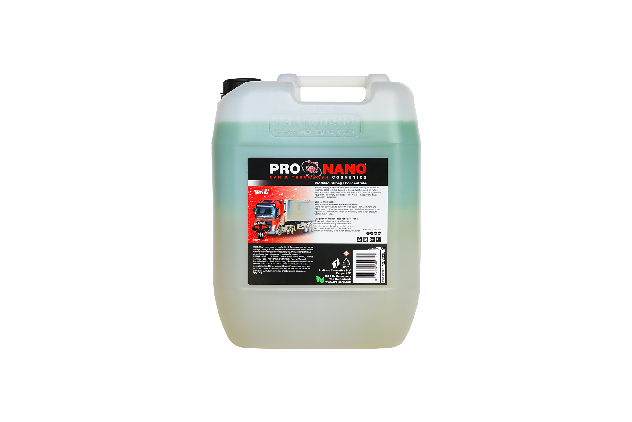 ProNano Strong is een krachtige tweefasige reiniger, ontwikkelt voor extreem vervuilde voertuigen. Het product is geschikt voor het grondig reinigen van o.a. polyester, schuif- en kantel trailers, motoren, chassis, bouwmachines. Tijdens het wassen zorgt het product voor een dik en stabiel sneeuwschuim, waardoor de vervuiling effectief aan de shampoo blijft plakken e gemakkelijk is af te spoelen is.