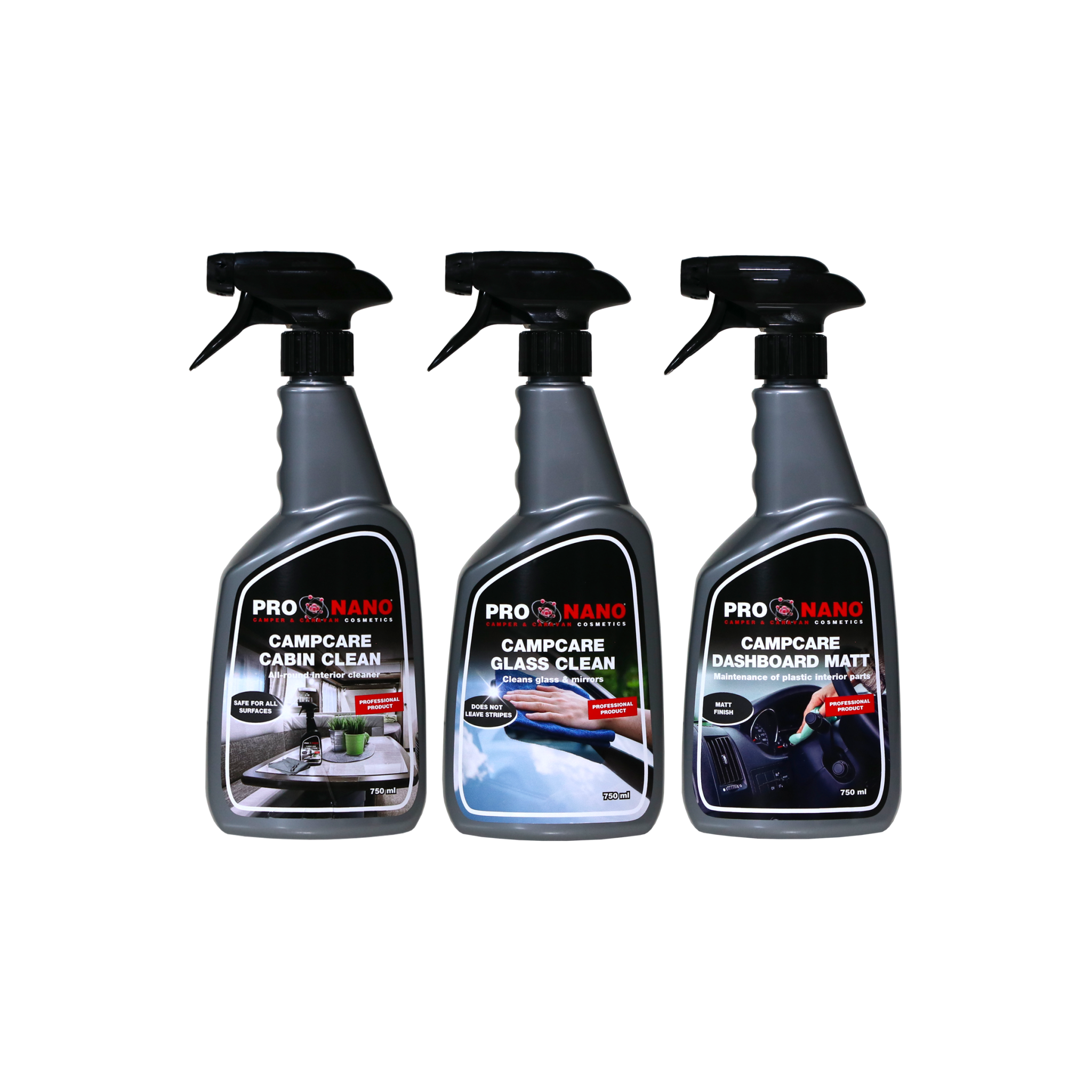 Gebruik de CampCare Cabin Clean voor het reinigen van het interieur. Gebruik vervolgens de CampCare Glass Clean voor het reinigen van ramen, spiegels en glas. Dit product kan zowel voor het interieur als voor het exterieur gebruikt worden. Breng de CampCare Dashboard Matt als laatste aan om kunststof onderdelen een matte finish te geven met anti-statisch effect.