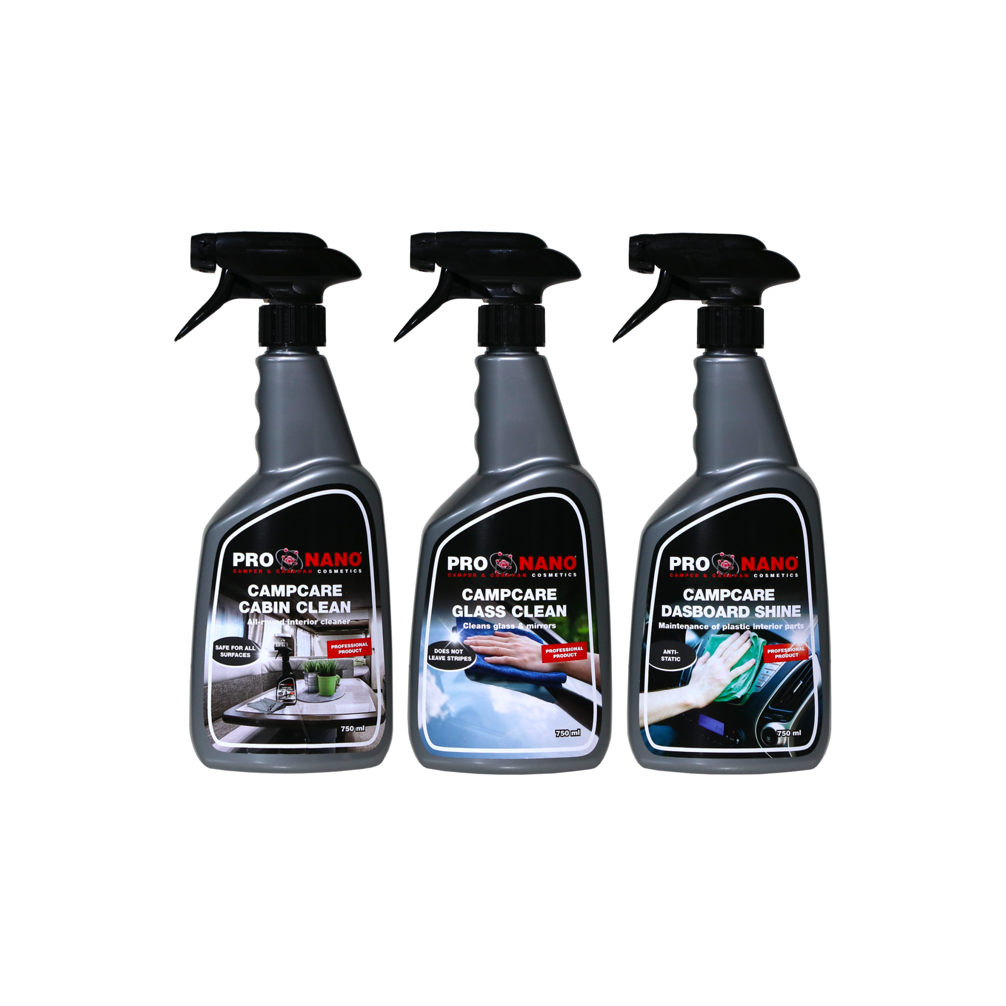 Gebruik de CampCare Cabin Clean voor het reinigen van het interieur. Gebruik vervolgens de CampCare Glass Clean voor het reinigen van ramen, spiegels en glas. Dit product kan zowel voor het interieur als voor het exterieur gebruikt worden. Breng de CampCare Dashboard Shine als laatste aan om de kunststof onderdelen te laten glanzen.