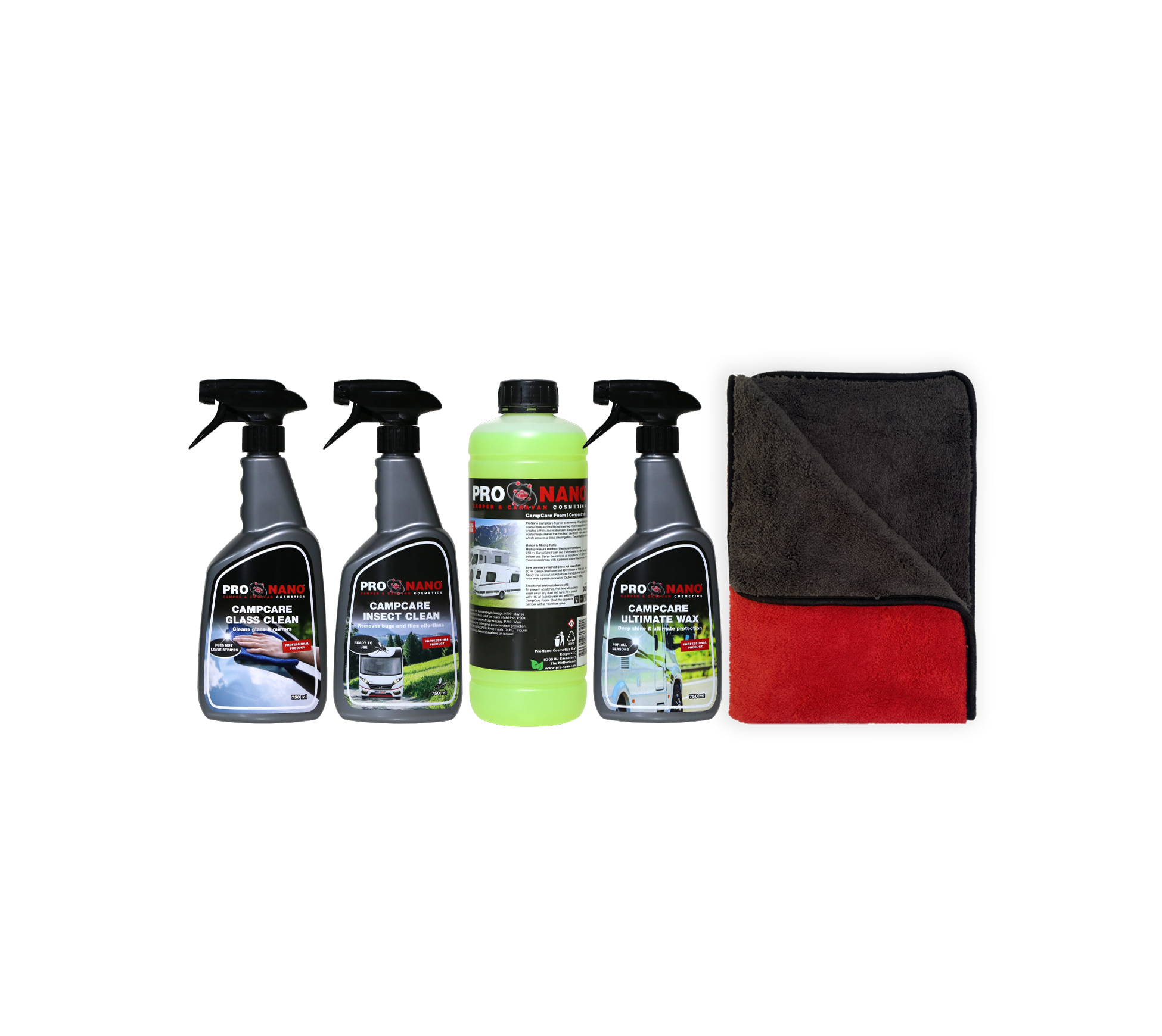 De ProNano CampCare Zomer Deal biedt alles voor een stralende zomer! Verwijder eenvoudig insecten en vuil, of je nu op reis bent, op de camping staat of thuis bent. Zorg voor een vlekkeloze reiniging en een glanzend resultaat!