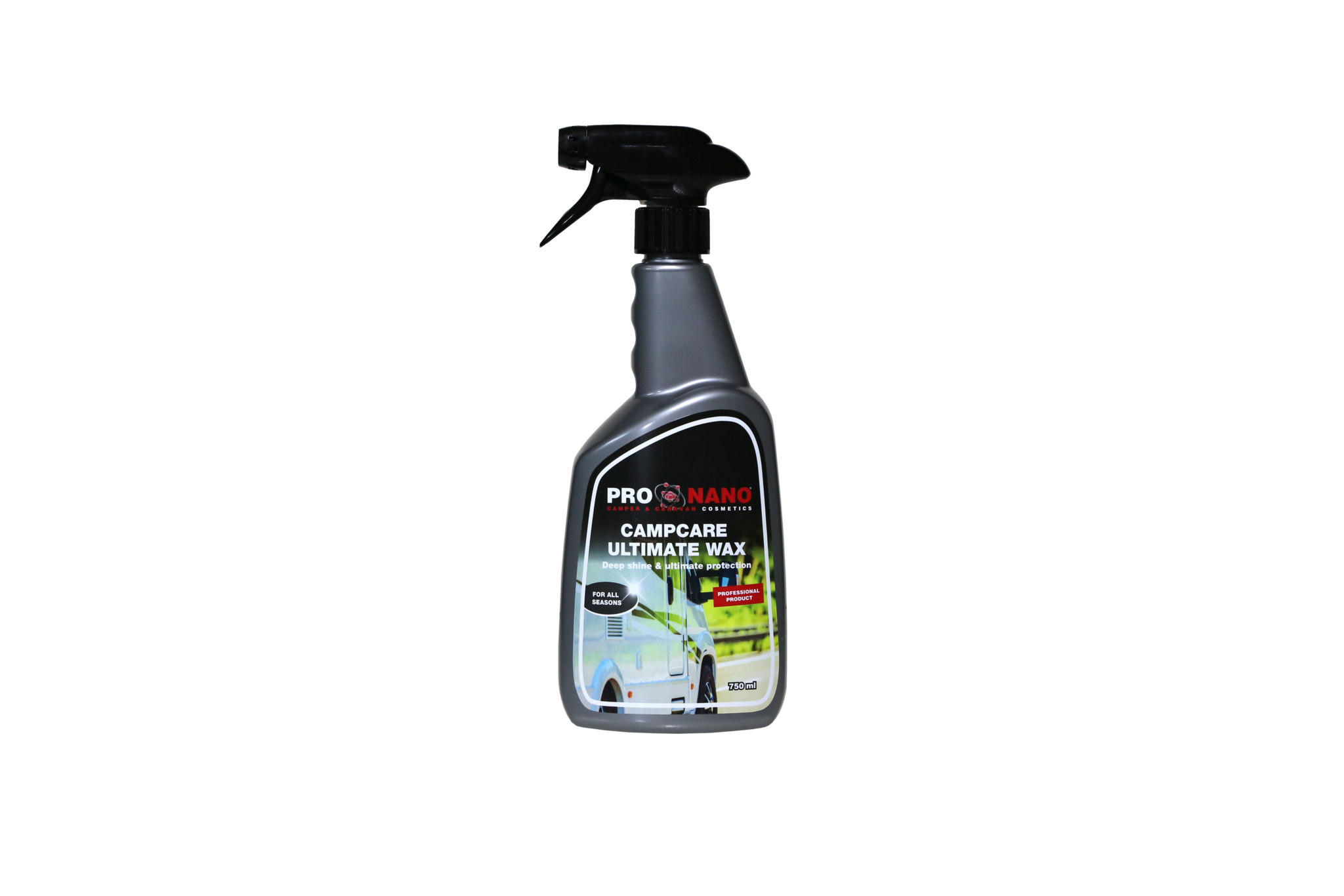 ProNano CampCare Ultimate Wax is een innovatieve spray wax voor campers en caravans. Deze hoogwaardige wax heeft uitstekende hydrofobe eigenschappen waardoor uw camper of caravan water- en vuilafstotend is. Het product geeft het behandelde oppervlak een hoogglans afwerking en verdiept de kleur. De wax is ideaal om altijd bij de hand te hebben, het kan thuis worden aangebracht, onderweg of op uw vakantiebestemming, zo is de camper of caravan altijd optimaal beschermd.