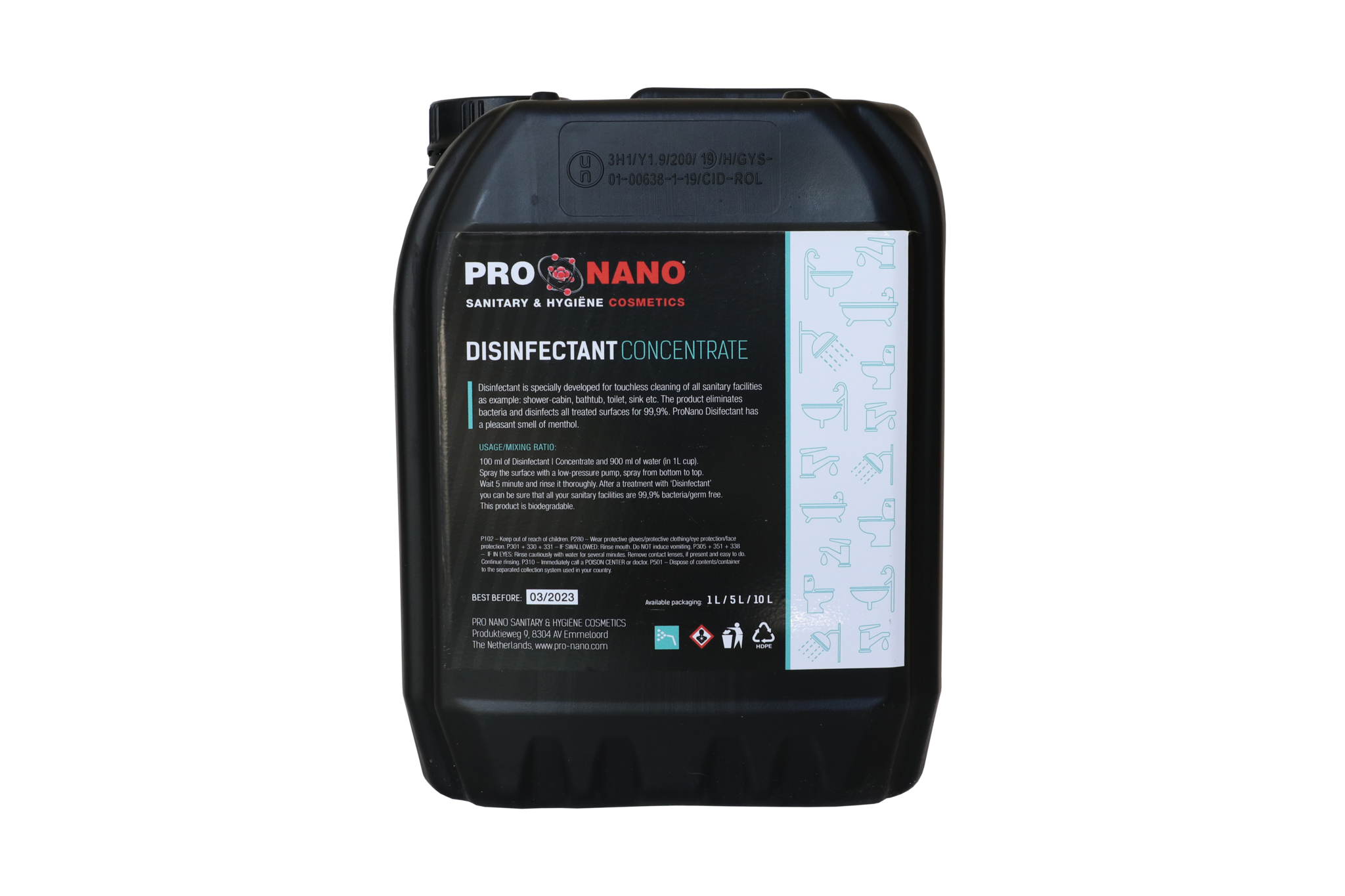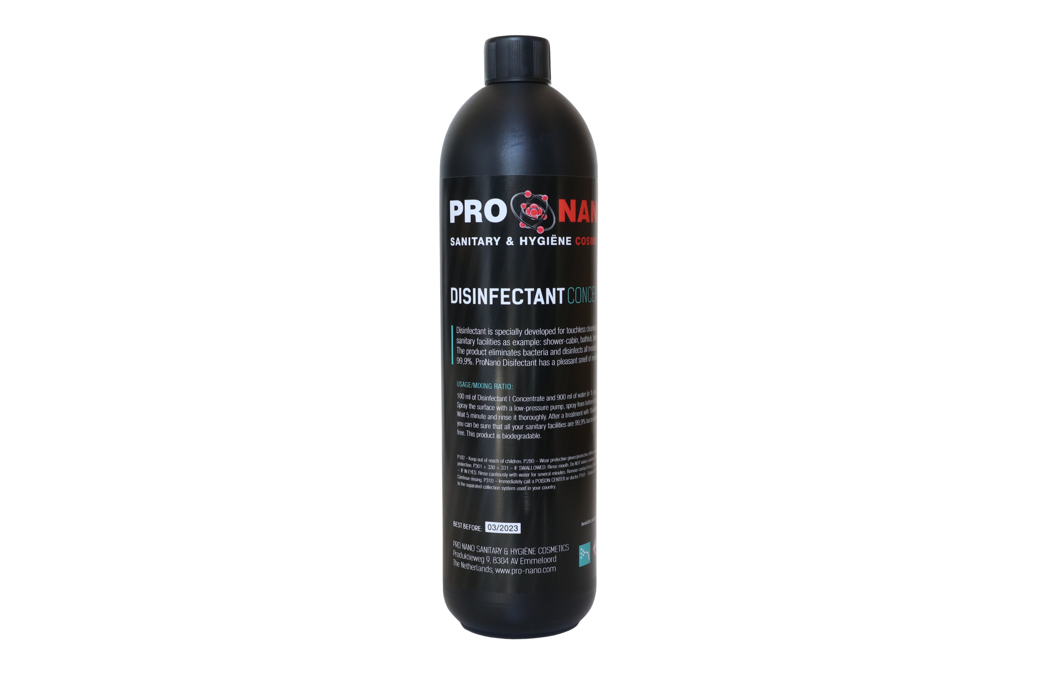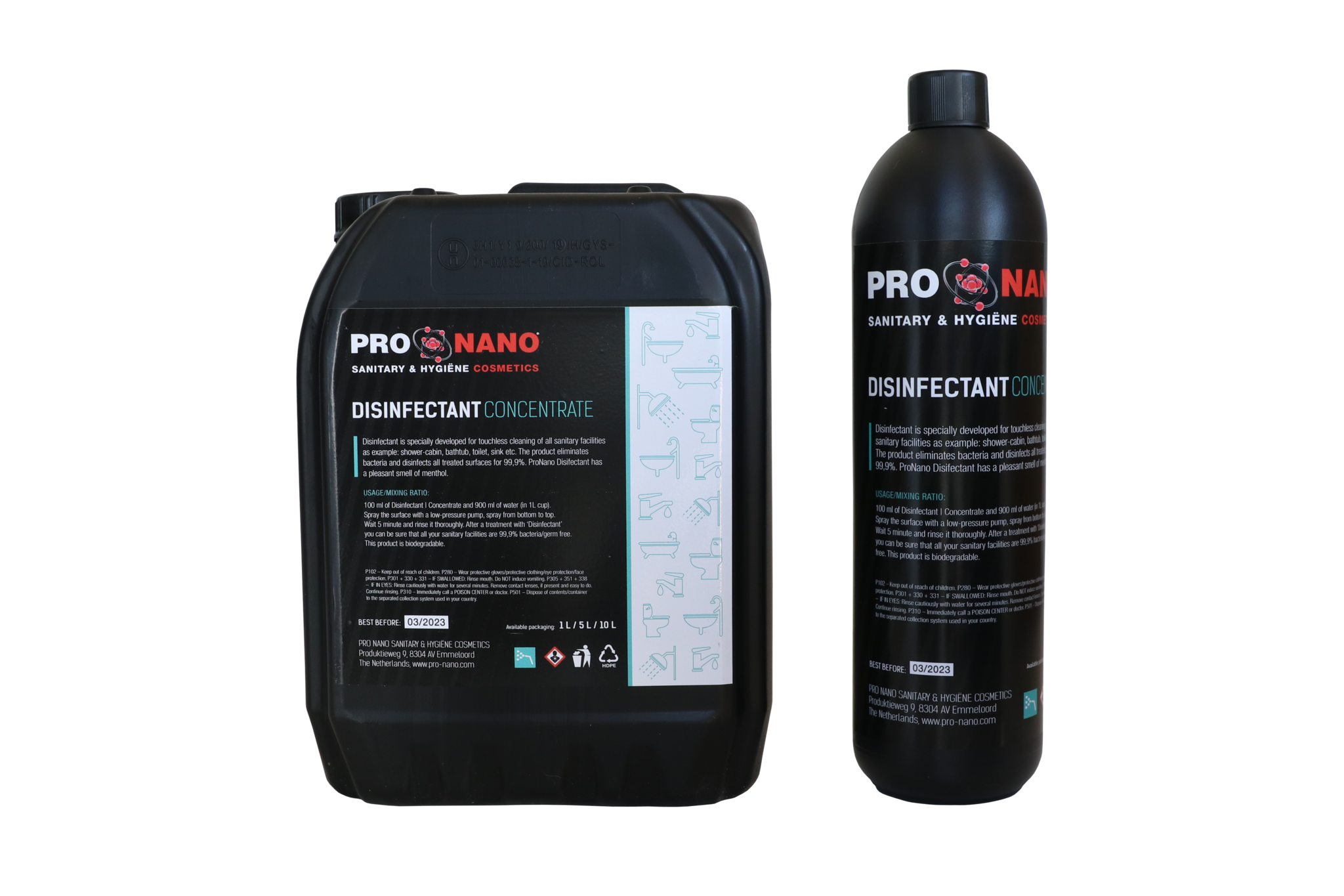 Desinfectant | Concentrate is speciaal ontwikkeld voor het contactloos reinigen van alle sanitaire voorzieningen zoals: douchecabine, badkuip, toilet, wastafel etc. Het product verwijdert bacteriën en desinfecteert alle behandelde oppervlakken voor 99,9%. ProNano Desinfectant heeft een aangename geur van menthol.