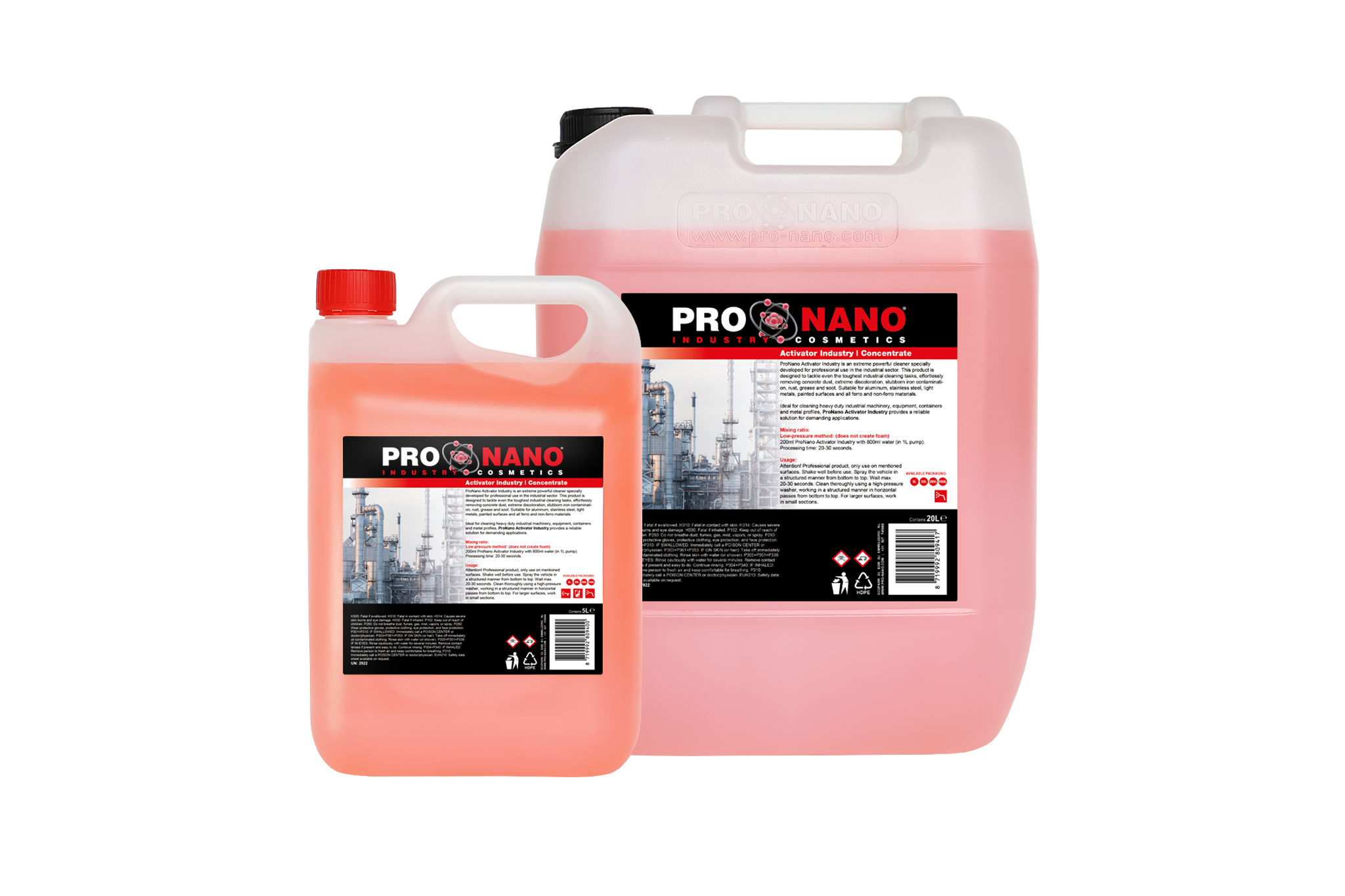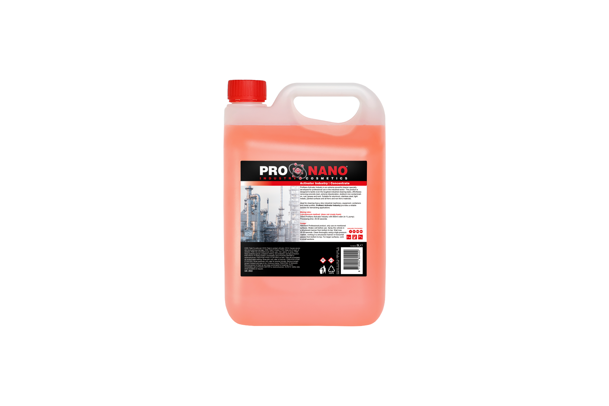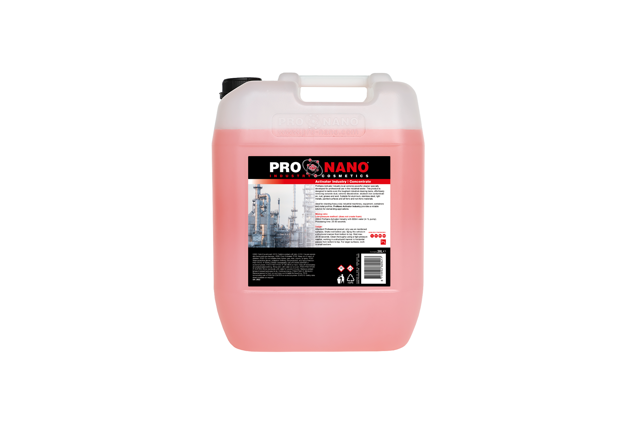 ProNano Activator Industry is een krachtige reiniger voor professioneel gebruik, ideaal voor het verwijderen van hardnekkige vervuiling zoals roest, vet en betonstof op metalen en geverfde oppervlakken. Perfect voor zware industriële toepassingen.