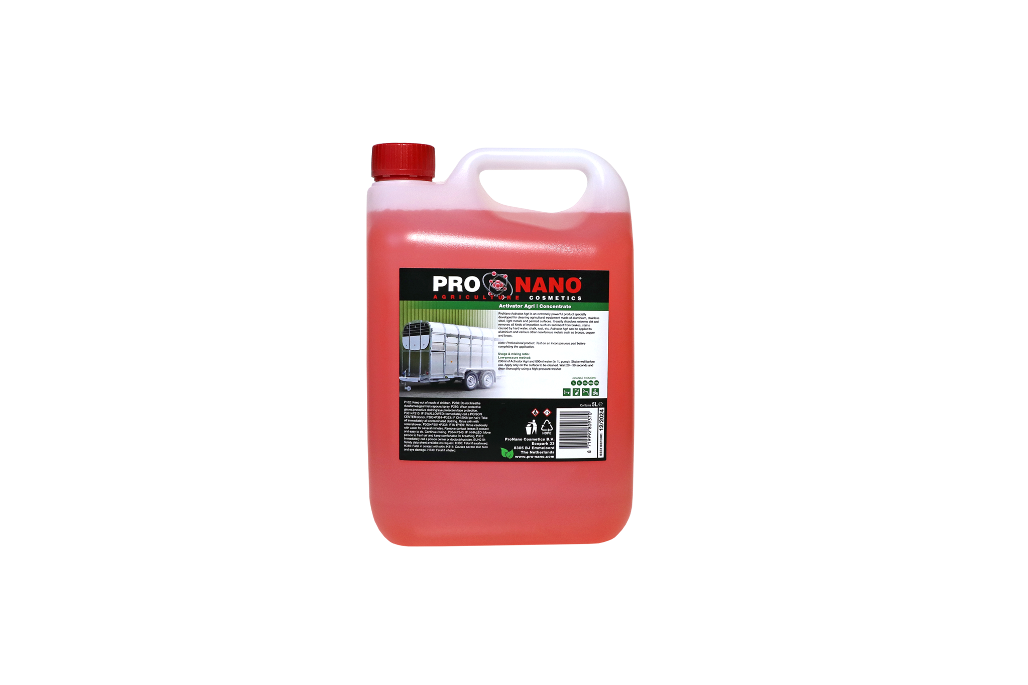ProNano Activator Agri is een extreem krachtige reiniger voor aluminium, RVS, licht metaal en gespoten oppervlakken. Het lost vuil moeiteloos op en verwijdert verkleuring van o.a. bronwater en agrarische bestrijdingsmiddelen van het oppervlak.