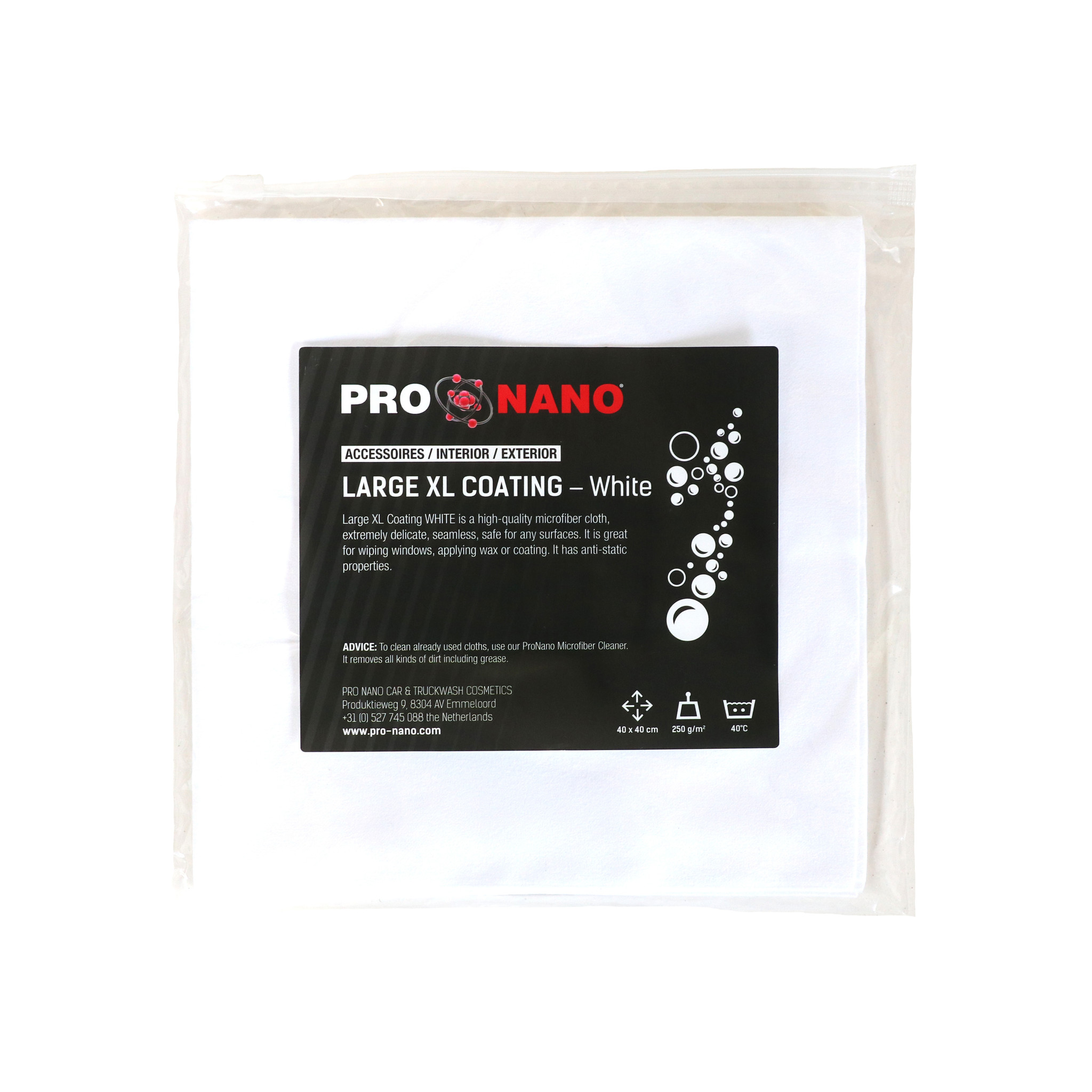 Schenk een aantal druppels op de bijgeleverde ProNano Black Pad en verdeel gestructureerd en gelijkmatig over het oppervlak. Laat het product gedurende 10 minuten drogen. Poets vervolgens op tot hoogglans met de bijgeleverde ProNano Large XL Coating doek.