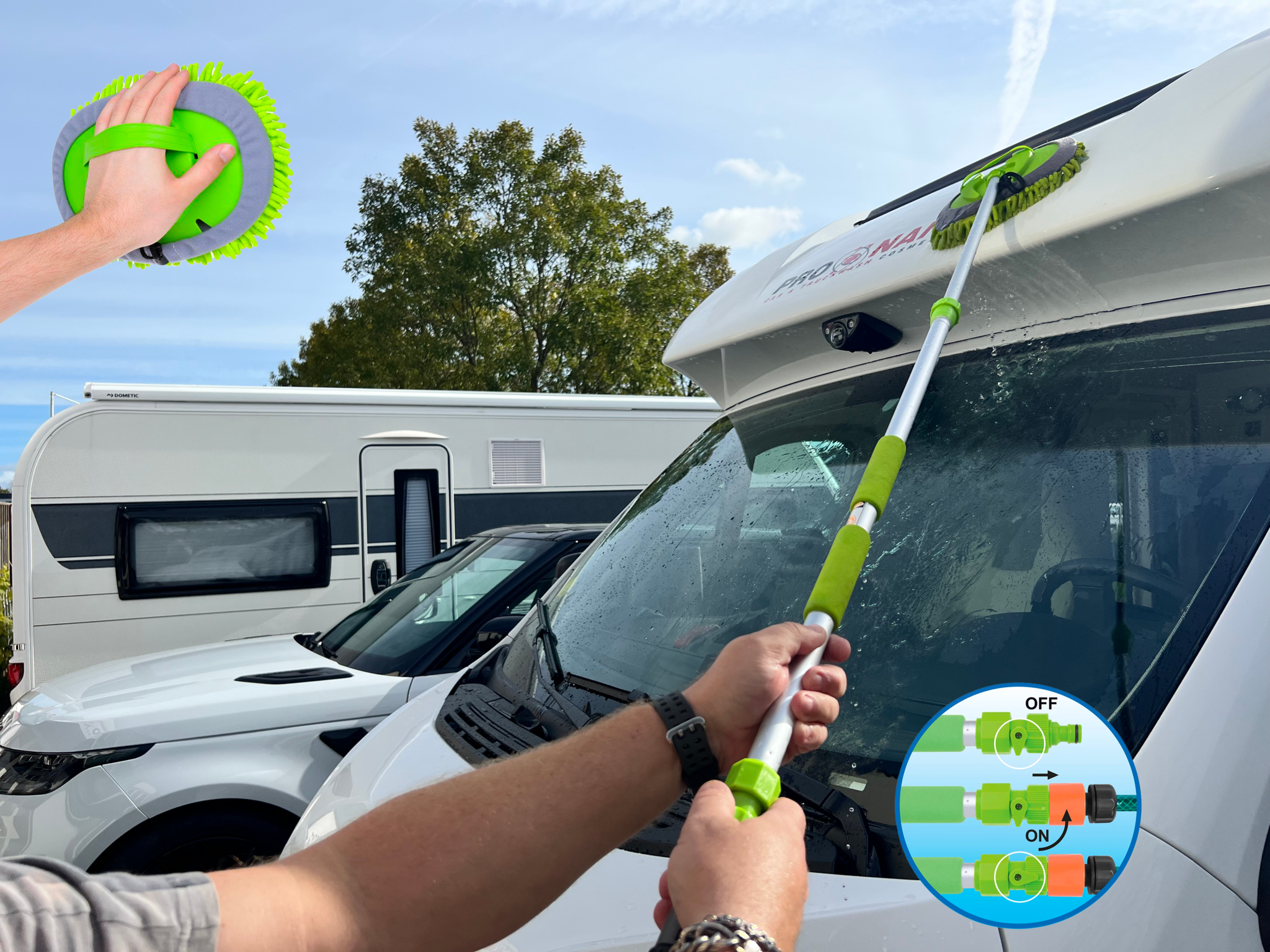 De ProNano CampCare Wash Borstel is een telescopische borstel die uit te schuiven is tot maar liefst 1,65 meter! Met deze praktische borstel reinigt u moeiteloos uw camper of caravan. Dankzij de maximale lengte kunt u ook de bovenkant van uw voertuig grondig schoonmaken. De borstel is geschikt voor Gardena-aansluitingen en beschikt over een watertoevoer. Het lichtgewicht ontwerp zorgt ervoor dat de borstel gemakkelijk in gebruik is. De zachte microvezels nemen vuil perfect op, zonder het oppervlak te beschadigen.